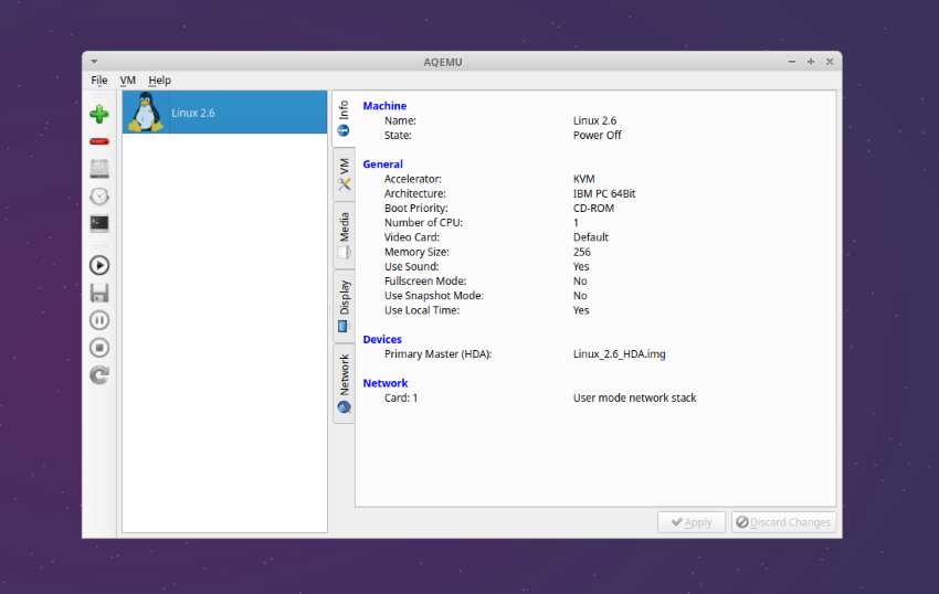 Similar to virt-manager, AQEMU is useful for anyone who wants to use KVM/QEUMU-powered VMs without having to use the command-line and learn its flags.