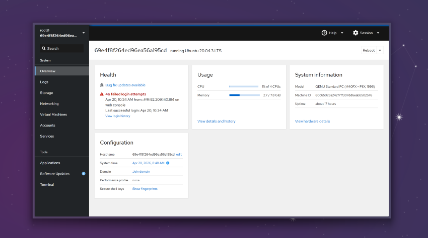 - Integrated with Cockpit's system monitoring (CPU, RAM, storage, networking, logs)