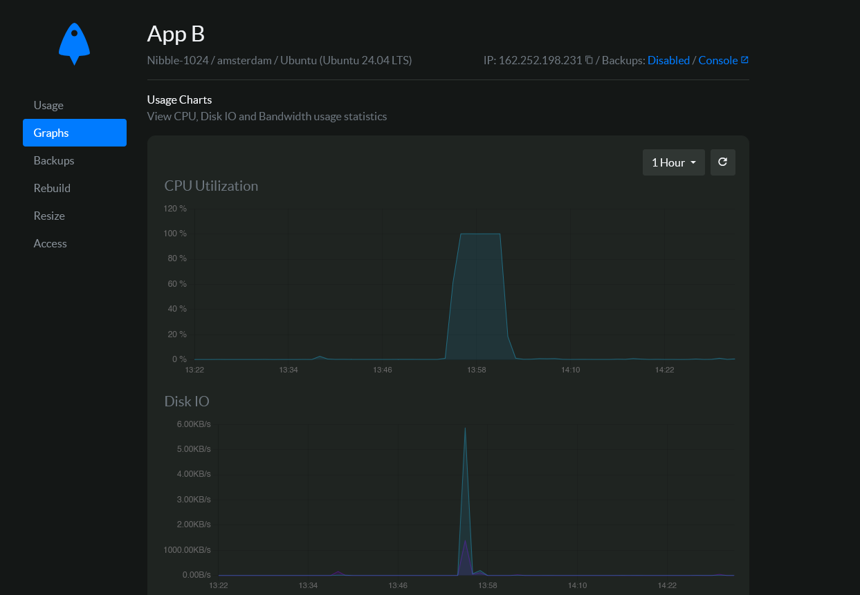 BitLaunch VPS customers can easily check their historical CPU, bandwidth, and disk utilization by clicking the server in their control panel and selecting "Graphs". If your host does not provide such tools, you can read our guide on Linux performance monitoring to check for yourself.
