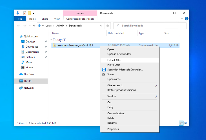 - First, download the TeamSpeak Server on your Windows Server install or VPS. You can find the official versions here. Right-click the downloaded .zip file and press "Extract All..."