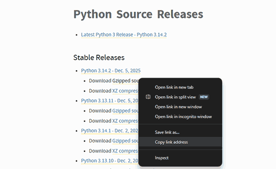sudo apt install build-essential zlib1g-dev libncurses5-dev libgdbm-dev libnss3-dev libssl-dev libreadline-dev libffi-dev wget build-essential2. Go to the Python source code page, right-click the version you want, and choose "Copy link address".