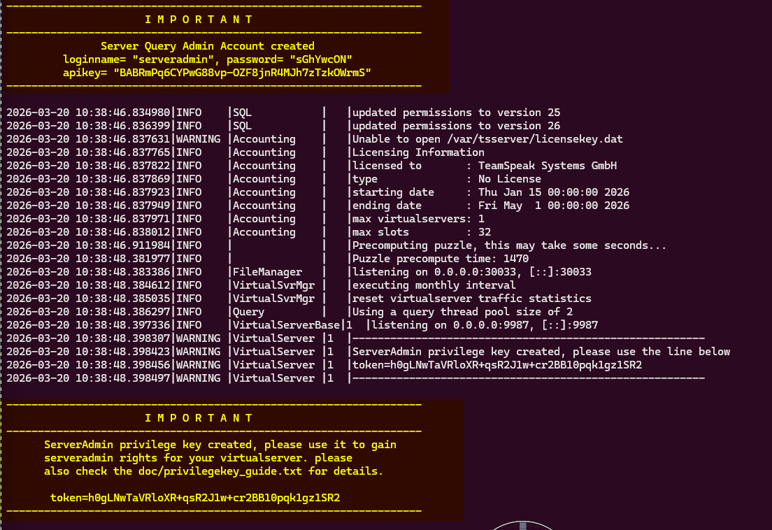 touch .ts3server_license_acceptedin the install directory. - First Boot — Start the server and save the admin password and privilege key from the output.