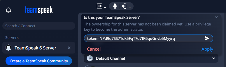 Finally, at the top of your screen, click the dropdown arrow next to "Is this your TeamSpeak Server?" and paste your privilege key.