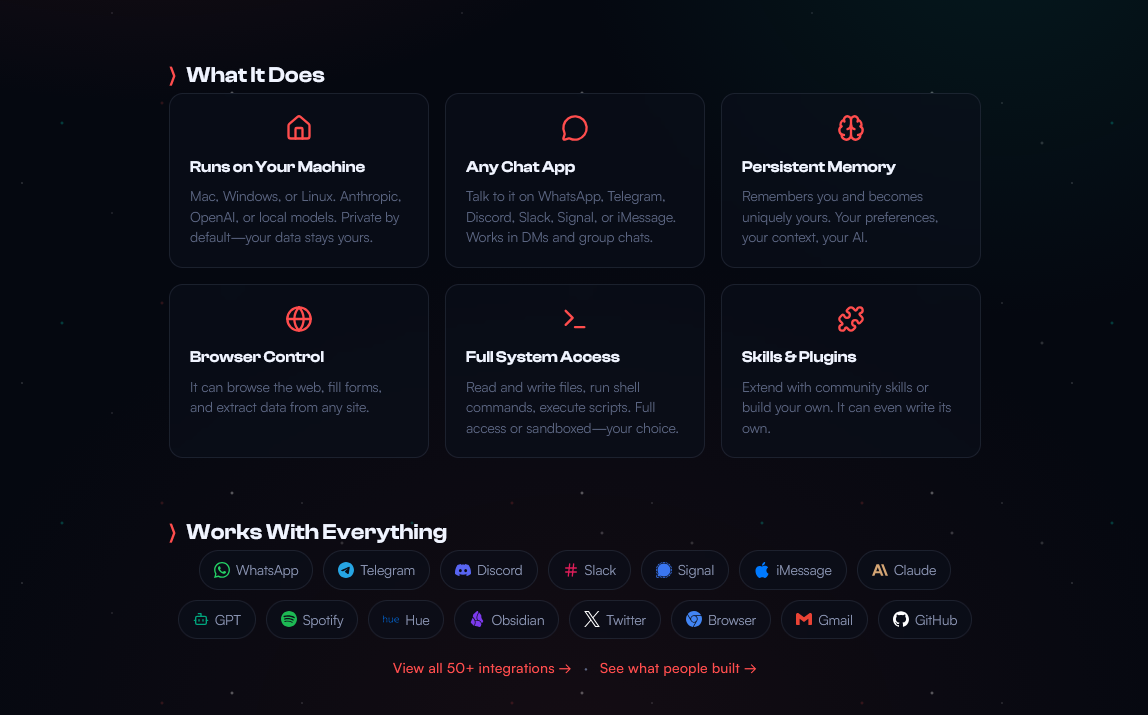 OpenClaw promises a wide range of functionality on its website, but the key points are OpenClaw's ability to run locally, work with any chat app, hold persistent memory, control your browser, run system commands, and be extended by the community with skills. It's worth looking at each of these in more detail.