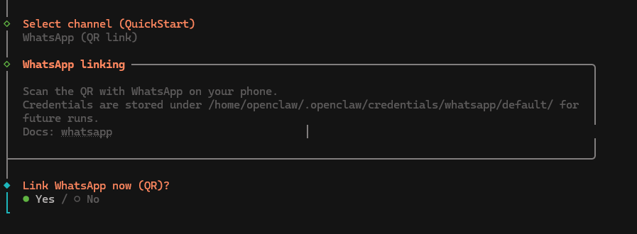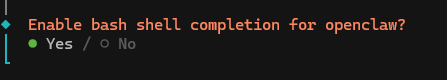 12. Optionally, enable bash shell completion. If you turn this on, OpenClaw will help you to complete the commands you begin typing, making using it faster and more intuitive.