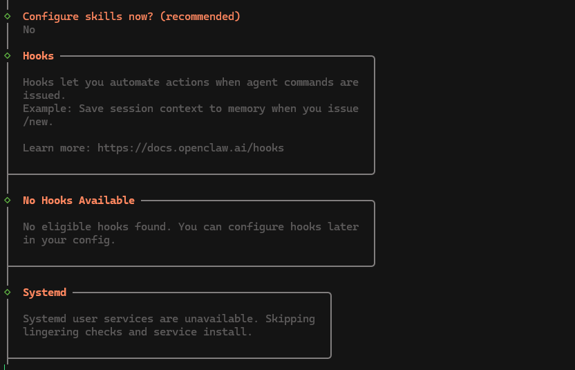 11. We'll select "No" when the installer asks you if you want to install skills, but you can optionally choose "Yes" to set up nano banana, whisper, etc.
