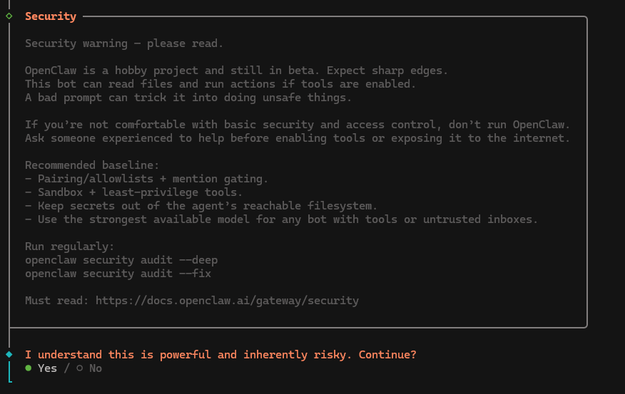 curl -fsSL https://openclaw.ai/install.sh | bash2. Wait for the install to complete. You'll have to choose "Yes" under the "I understand this is powerful and inherently risky" heading to continue. We recommend you actually read the security advisory above it — there's some key advice there!