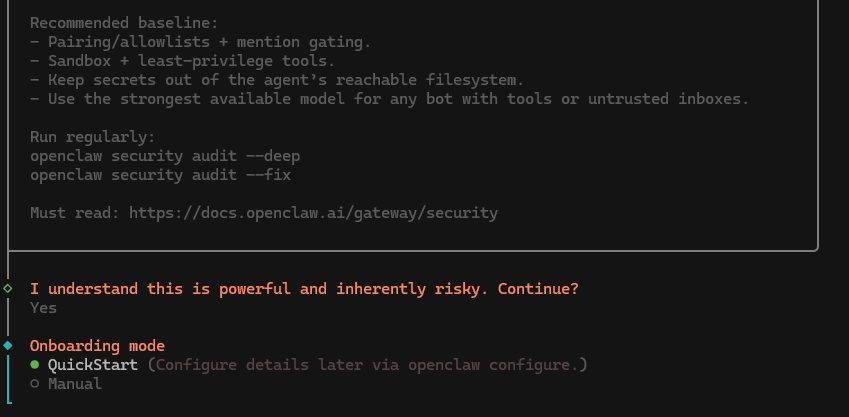 iwr -useb https://openclaw.ai/install.ps1 | iex2. Wait for the install to complete, then use the arrow keys to select "Yes" under the "I understand this is powerful and inherently risky" heading.
