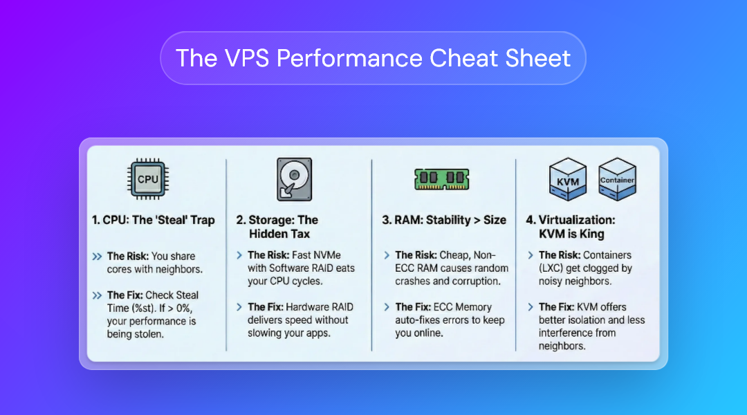 Perhaps the biggest misconception in virtual hosting is that "1 vCPU" is a standard form of measurement. In reality, VPS performance is impacted by a wide variety of factors, from the quality of the hardware used to the invisible 'steal time' caused by poor virtualization management.