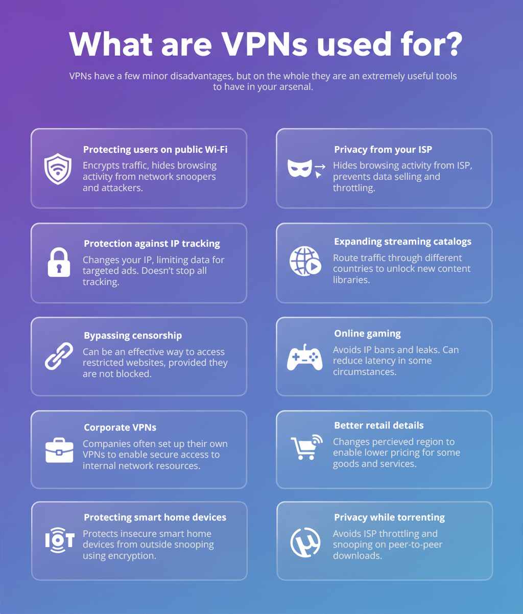 Despite a few downsides, having access to a VPN can be incredibly useful. While there are dozens of use cases, the primary ones include: